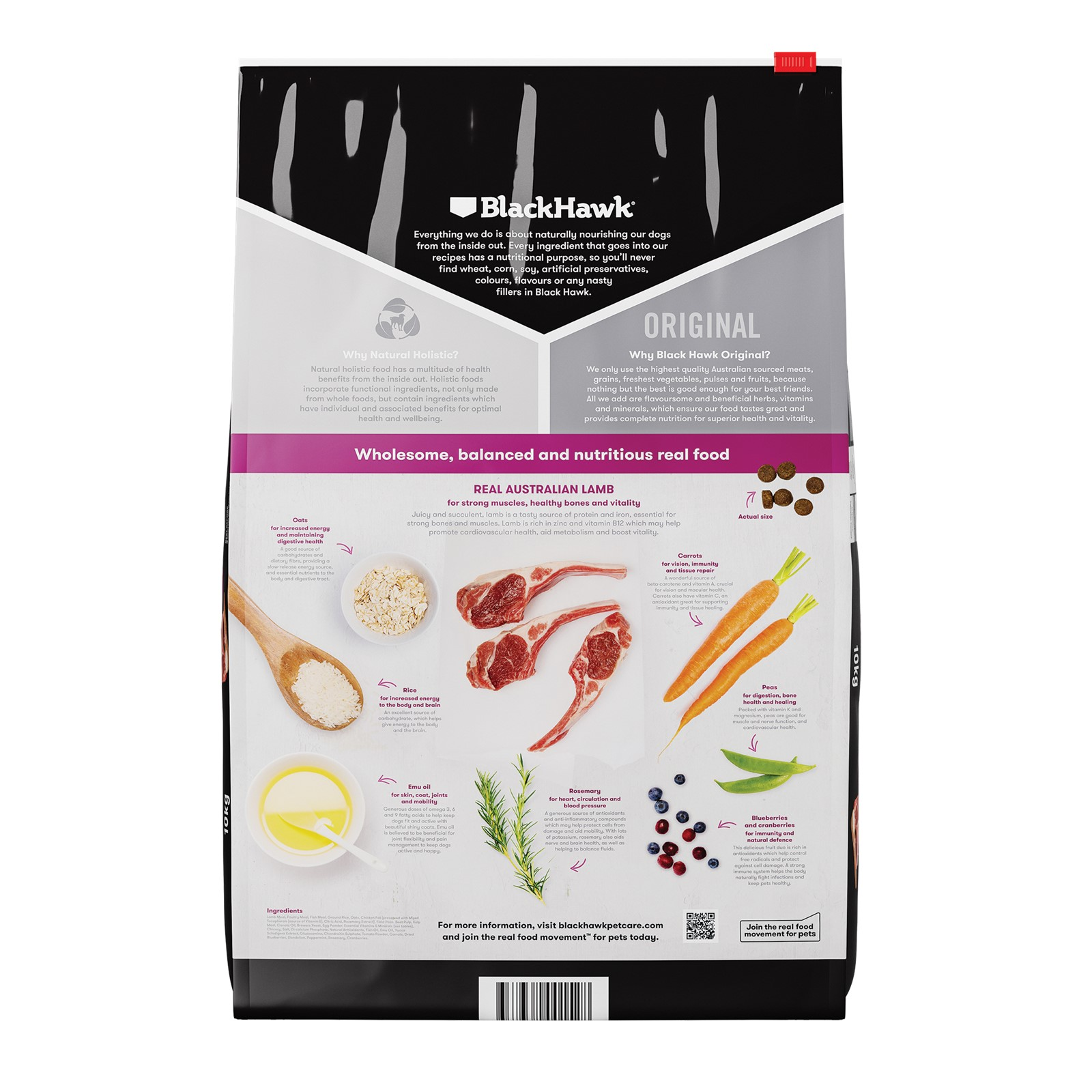 Lamb Meal, Chicken Meal, Fish Meal, Ground Rice, Oats, Chicken Fat (preserved with Mixed Tocopherols [source of Vitamin E], Citric Acid, Rosemary Extract), Field Peas, Beet Pulp, Kelp Meal, Canola Oil, Brewers Yeast, Egg Powder, Essential Vitamins & Minerals (see tables), Chicory, Salt, Di-calcium Phosphate, Natural Antioxidants, Fish Oil, Emu Oil, Yucca Schidigera Extract, Glucosamine, Chondroitin Sulphate, Tomato Powder, Carrots, Dried Blueberries, Dandelion, Peppermint, Rosemary, Cranberries