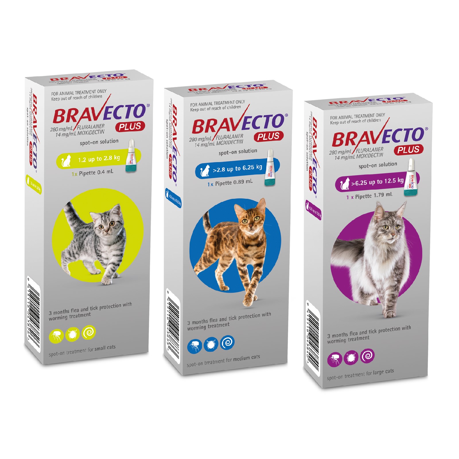 Bravecto Plus for Cats is available for cats ranging from 1.2 – 12.5 kg. One dose provides 2 months protection against fleas, paralysis ticks and heartworm and treats roundworm, hookworm and ear mites. For cats above 12.5 kg body weight, use a combination of two pipettes that most closely matches the body weight.