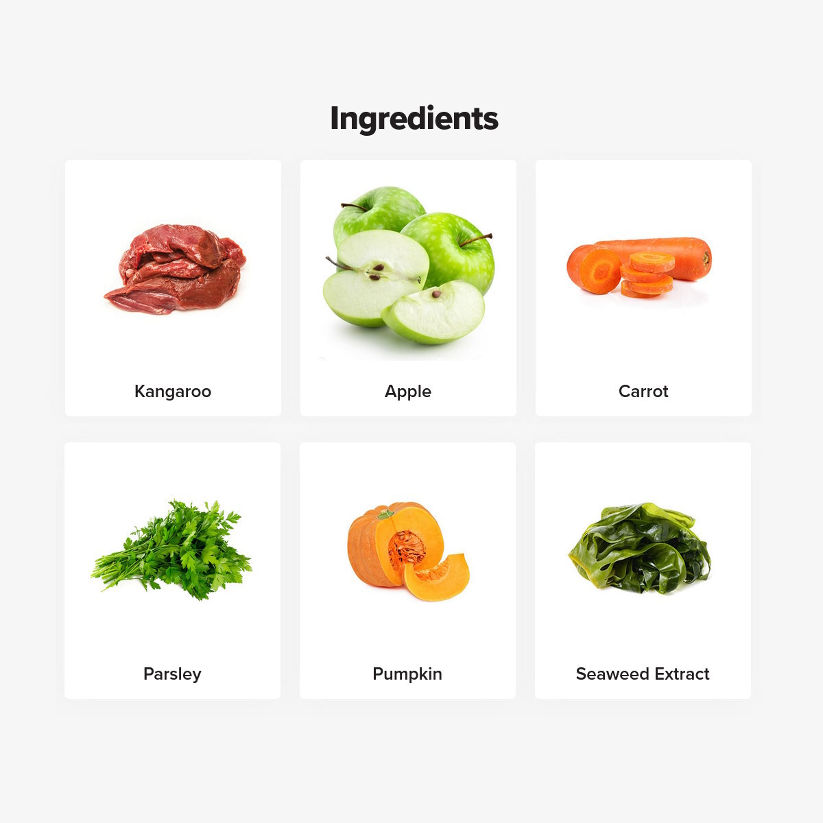 INGREDIENTS: Australian Kangaroo (whole meat & selected organs), pumpkin, carrot, sweet potato, vitamins & minerals, apple fibre, functional oils (coconut, sunflower, algae, flaxseed, evening primrose), postbiotics, chicory root extract, Algimun®, salt, natural antioxidants, taurine, chondroitin, glucosamine.